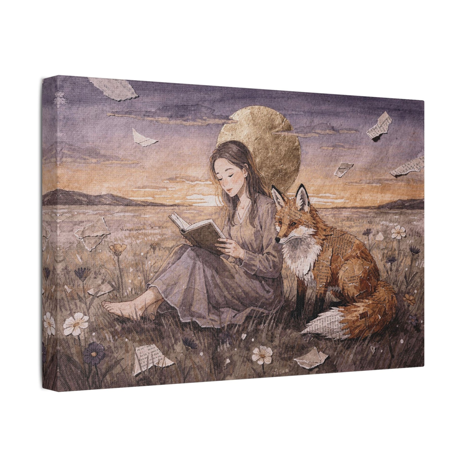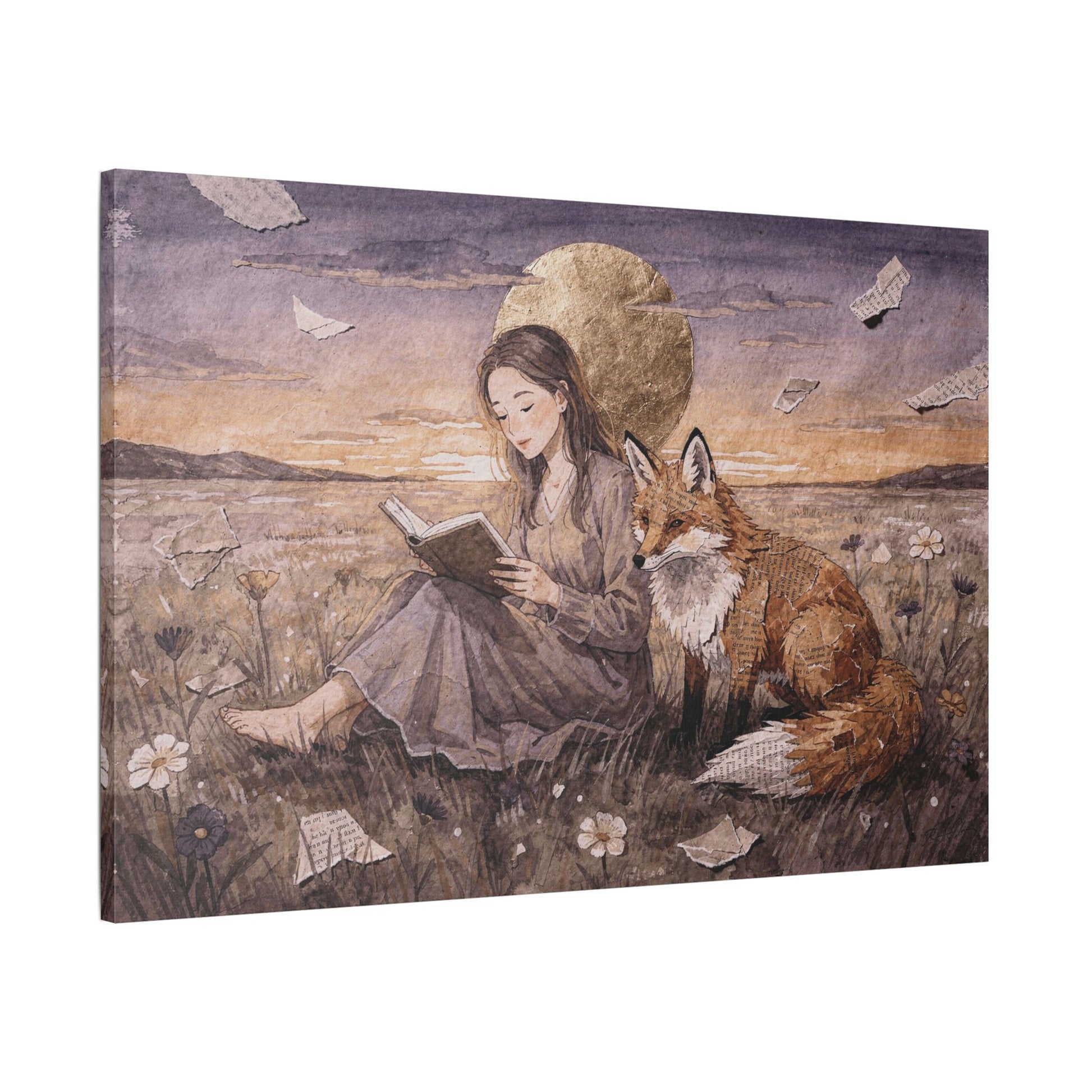 Meadow at Dusk captures a quiet, dreamlike moment of stillness and companionship. A young woman sits barefoot in a wildflower meadow, absorbed in a book, while a fox rests calmly at her side. Above them, a glowing golden moon rises against a soft evening sky, lending the scene a gentle, almost mythic calm.