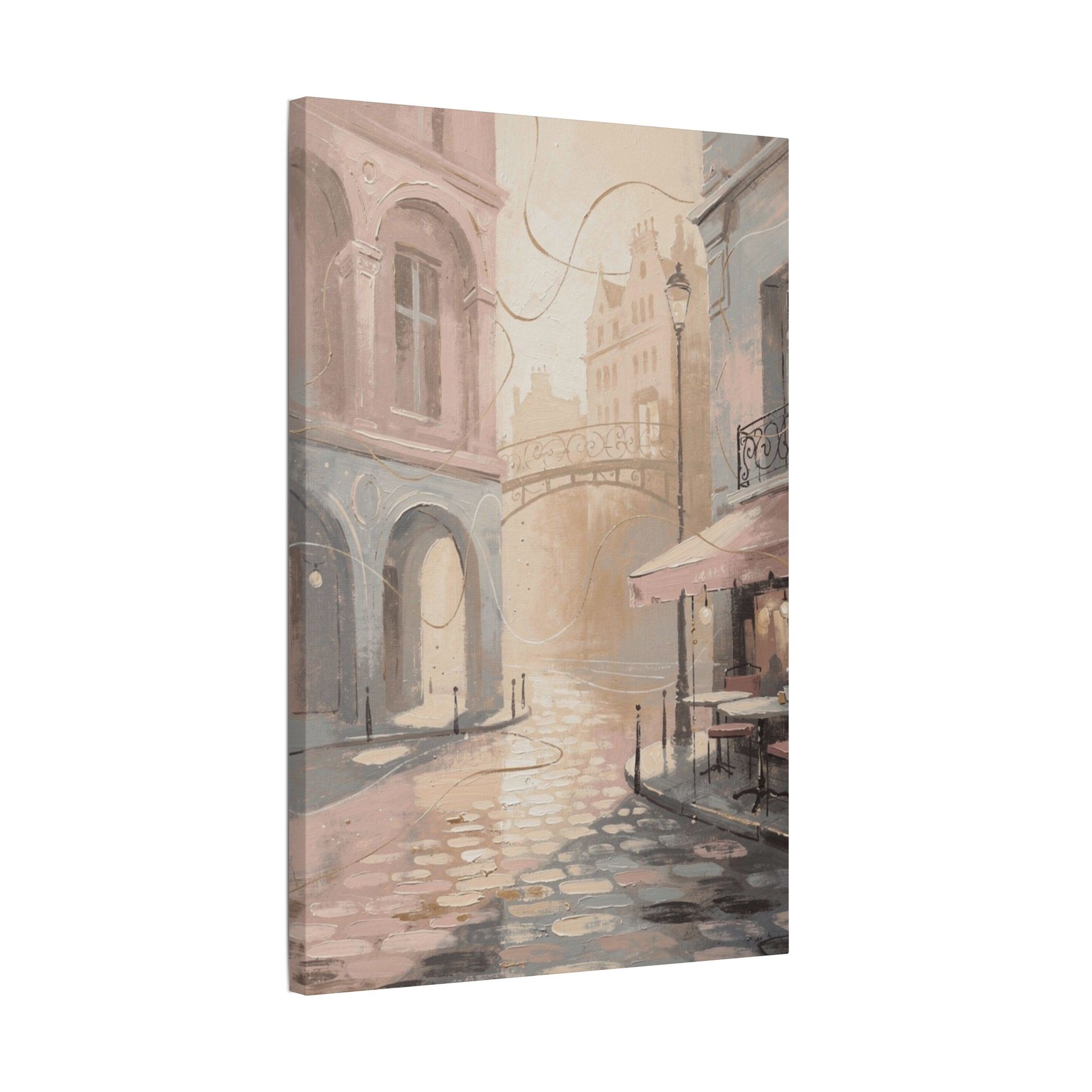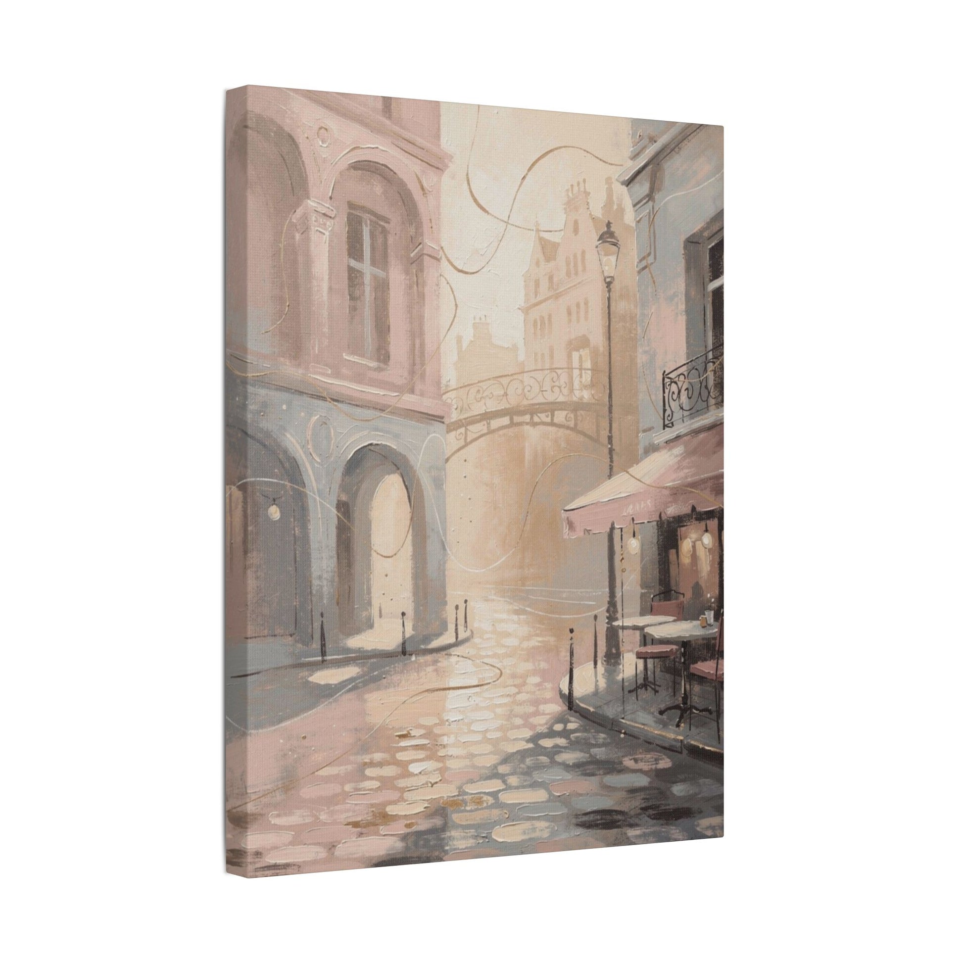 Bring the timeless charm of Paris into your home with this dreamy pastel street-scene artwork. Featuring sun-washed cobblestones, graceful arches, a wrought-iron bridge, and a cozy café terrace, the piece captures the romantic stillness of early morning in the city. The muted pink, beige, and soft blue palette adds a soothing, sophisticated touch that complements modern, minimalist, and classic interiors alike.